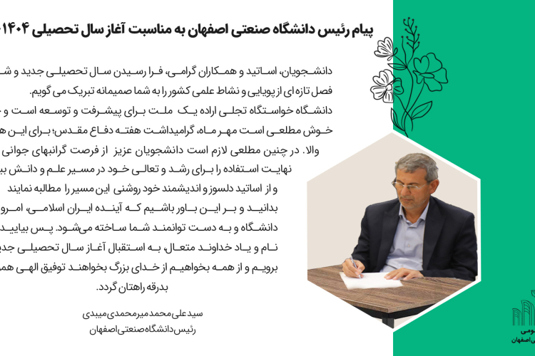پيام رئيس دانشگاه صنعتي اصفهان به مناسبت آغاز سال تحصيلي 1404-1403