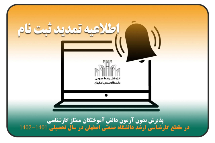 اطلاعيه تمديد ثبت نام پذيرش بدون آزمون دانش آموختگان ممتاز كارشناسي در مقطع كارشناسي ارشد دانشگاه صنعتي اصفهان در سال تحصيلي 1402-1401