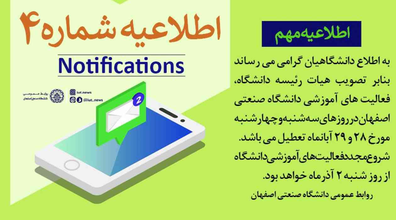 به اطلاع دانشگاهيان گرامي مي رساند بنابر تصويب هيات رئيسه دانشگاه، فعاليت هاي آموزشي دانشگاه صنعتي اصفهان در روزهاي سه شنبه و چهارشنبه مورخ 28 و 29 آبانماه تعطيل مي باشد.