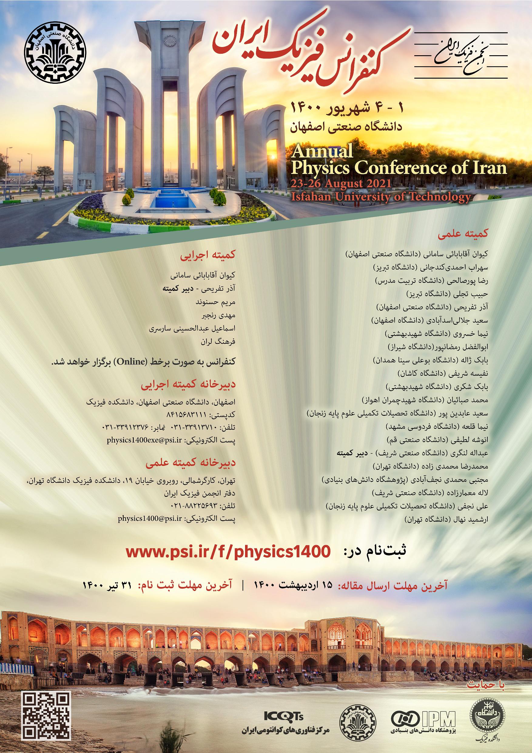 انجمن فيزيك ايران با همكاری دانشكده فيزيك دانشگاه صنعتي اصفهان كنفرانس سالانه فيزيك ايران را، از 1 تا 4 شهريورماه به صورت برخط و با حضور چهره‌های نام‌آشنا و مطرح دنیا در عرصه فیزیک برگزار می‌‌كند.