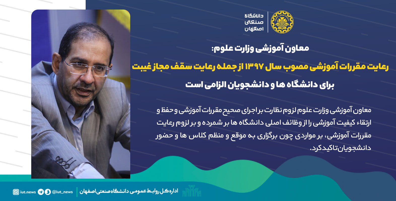 معاون آموزشی وزارت علوم با تاکید بر پیگیری و نظارت دانشگاه ها جهت اجرای صحیح مقررات آموزشی گفت: 'دو ابلاغیه در نیمسال جاری برای دانشگاه ها و موسسات آموزش عالی دولتی و غیردولتی ارسال شده است. ابلاغیه اول تاکید بر رعایت دقیق مقررات آموزشی در راستای حفظ و ارتقاء کیفیت آموزشی است. ارتقاء کیفیت آموزشی، رعایت سقف مجاز غیبت و سنوات دانشجویان، برگزاری حضوری کلاسها، برگزاری منظم امتحانات و رعایت تقویم مصوب آموزشی از جمله الزاماتی است که دانشگاهها و دانشجویان بایستی به رعایت آن اهتمام ورزند.
