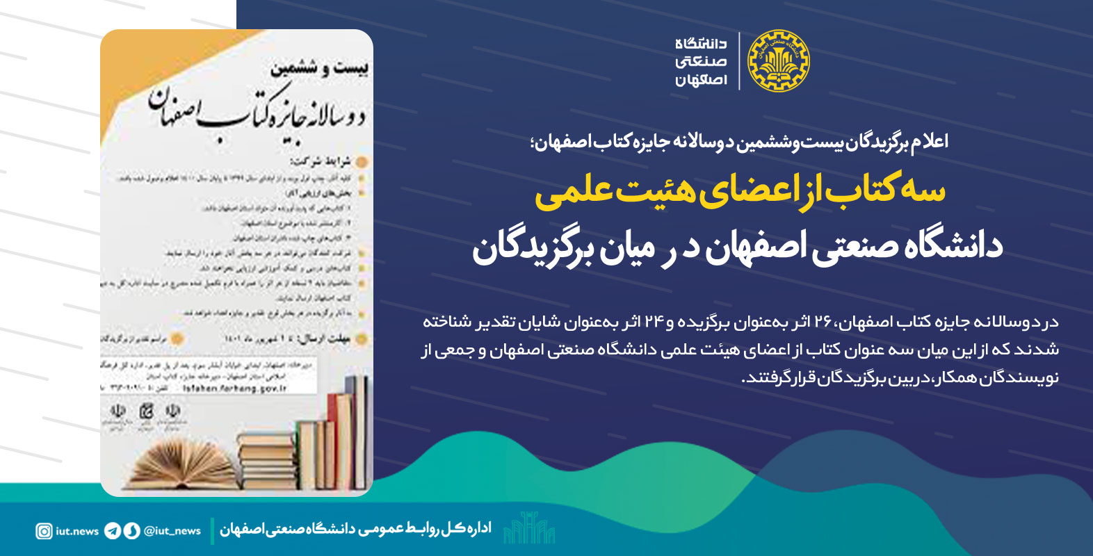 در دوسالانه جایزه کتاب اصفهان، ۲۶ اثر به‌عنوان برگزیده و ۲۴ اثر به‌عنوان شایان تقدیر شناخته شدند که از این میان سه عنوان کتاب از اعضای هیئت‌علمی دانشگاه صنعتی اصفهان و جمعی از نویسندگان همکار، در بین برگزیدگان قرار گرفتند.
