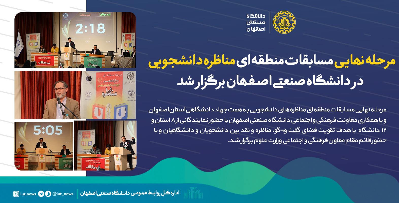 مرحله نهایی مسابقات منطقه ای مناظره های دانشجویی به همت جهاد دانشگاهی واحد صنعتی اصفهان و با همکاری معاونت فرهنگی و اجتماعی دانشگاه صنعتی اصفهان با حضور نمایندگانی از 8 استان و 12 دانشگاه با هدف تقویت فضای گفت وگو، مناظره و نقد بین دانشجویان و دانشگاهیان و با حضور قائم مقام معاون فرهنگی و اجتماعی وزارت علوم برگزار شد.