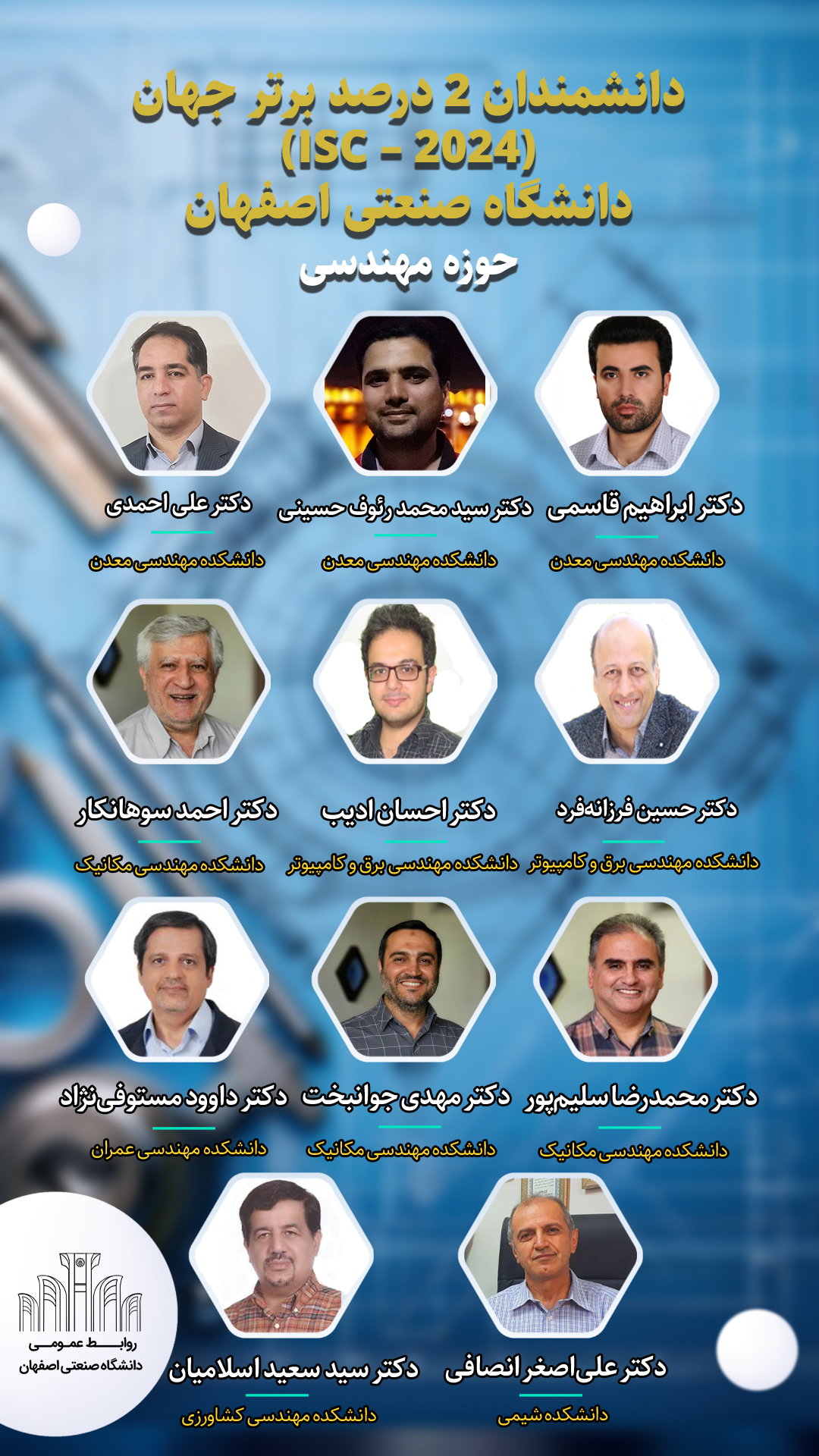دکتر حسین فرزانه فرد و دکتر احسان ادیب از اعضای هیأت علمی دانشکده مهندسی برق و کامپیوتر، دکتر احمد سوهانکار، دکتر محمد رضا سلیم پور و دکتر مهدی جوانبخت از اعضای هیأت علمی دانشکده مهندسی مکانیک، دکتر داوود مستوفی نژاد؛ عضو هیأت علمی دانشکده مهندسی عمران، دکتر علی اصغر انصافی، عضو هیأت علمی دانشکده شیمی و دکتر سید سعید اسلامیان، عضو هیأت علمی دانشکده مهندسی کشاورزی، دیگر پژوهشگران 2 درصد برتر جهان در حوزه موضوعی مهندسی از دانشگاه صنعتی اصفهان هستند.