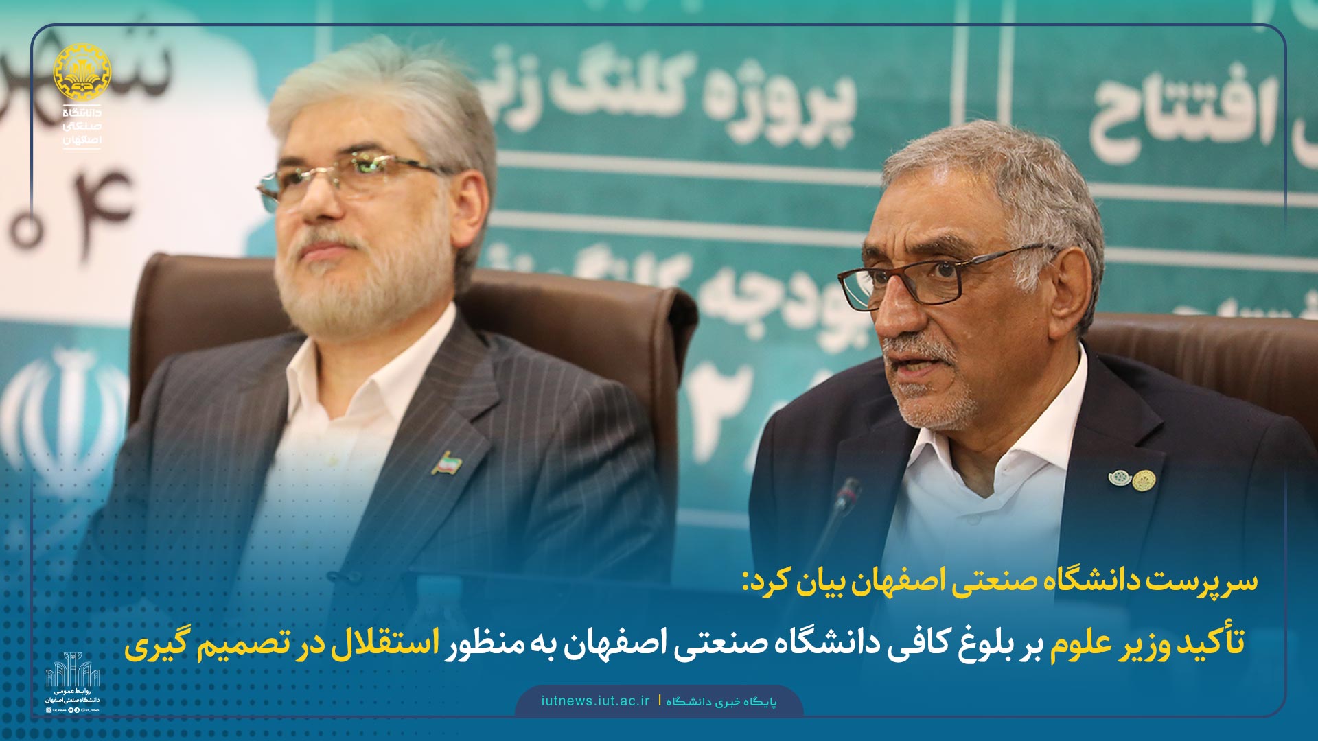 سرپرست دانشگاه صنعتی اصفهان بیان کرد: تأکید وزیر علوم بر بلوغ کافی دانشگاه صنعتی اصفهان به منظور استقلال در تصمیم گیری